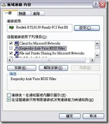 看到那個Kaspersky Anti-Virus NDIS Filter沒有?取消他前面的打勾,接下來就可以順利偵測到網路上的芳鄰了!至於設定網路上的芳鄰的方法,Windows XP的精靈很好用、說明也很多,網路上有更多圖文並茂的實例,我就不說明了。