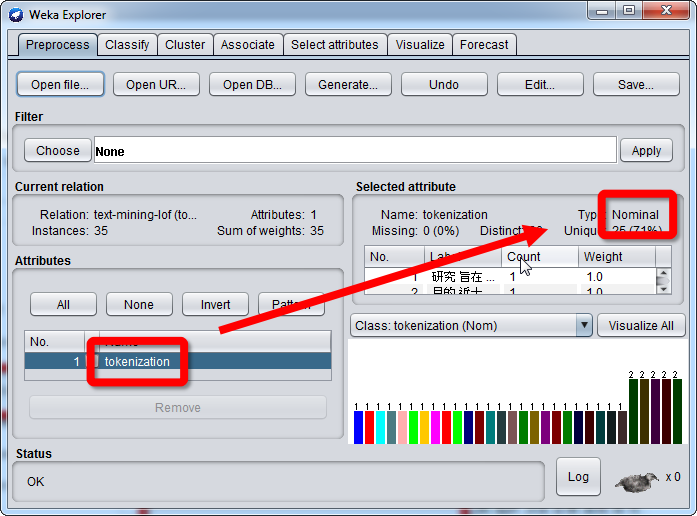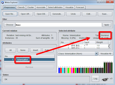 CSV檔案順利讀取。Weka會將CSV檔案每一個直欄視為一種屬性(attribute),而每個直欄的第一個橫列就是屬性的名稱。因為我們的工作表只有一個直欄,而直欄的第一個橫列就名為「tokenization」,所以這邊Weka載入CSV之後,就只有一個屬性,名為「tokenization」。